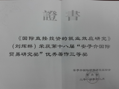 “安子介国际贸易研究奖”是由已故全国政协副主席、社会活动家、香港著名实业家安子介先生于 1991 年出资设立,并被教育部确定为部级奖。作为中国世界经济与国际贸易两个应用经济学二级学科的最高学术研究奖,现设“安子介国际贸易优秀著作奖”、“安子介国际贸易优秀论文奖”和“安子介国际贸易学术鼓励奖”。该奖项每两年评选一次,在国内外具有较大影响力。本届“安子介国际贸易研究奖”由近三十名海内外国际贸易领域知名专家担任评委,最终评出优秀著作奖 8 部,其中一等奖空缺,二等奖 3 部,三等奖 5 部;优秀论文奖 20 篇,其中一等奖 1 篇,二等奖 4 篇,三等奖 15 篇。刘辉群副教授的专著从众多优秀科研成果中脱颖而出,再次展现了我校青年教师的科研实力,也体现出beat365在线体育官网登录入口和国贸系多年来对青年教师提升科研能力给予的鼓励与支持。这是我校教师首次获得该奖项。
