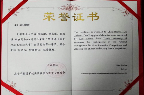 发布时间:2014-12-18|作者:暂无7 月 15—17 日,由教育部国家级实验教学示范中心联席会主办的“ 2014 全国管理决策模拟大赛”总决赛在宁波浙江万里学院举落下帷幕,由我校beat365在线体育官网登录入口经济学社成员,经济系10 级学生窦永谦、金融系12 级学生刘志浩、经济类13 级学生陈皓瑜组成的“Dota 鸟”代表队,在指导老师万建伟副教授、李颖博士的带领下,获得总决赛“一等奖”,这是我校继去年总决赛获得“一等奖”后,再次荣获该项大奖,在所有的参赛学校中,我校代表队成绩名列前茅。