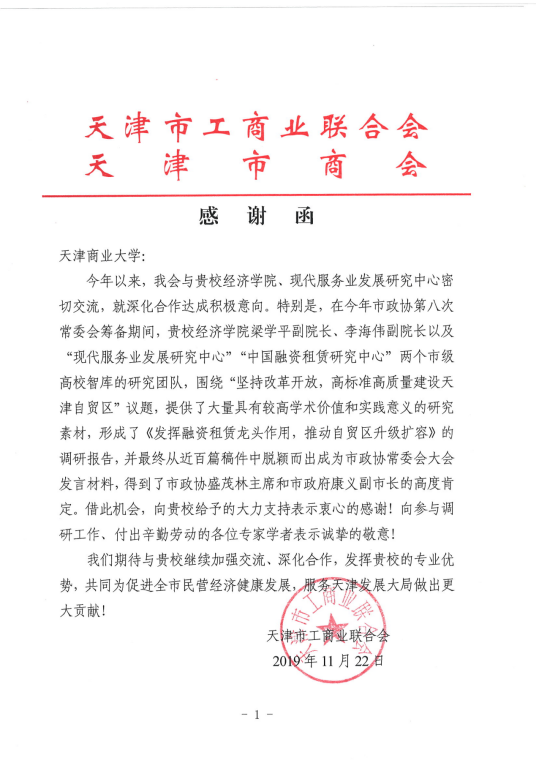 近日,天津市工商业联合会、天津市商会发来感谢函,对我校beat365在线体育官网登录入口、现代服务业发展研究中心、中国融资租赁研究中心在课题研究、专题调研等方面进行合作以及取得的成果表示感谢。