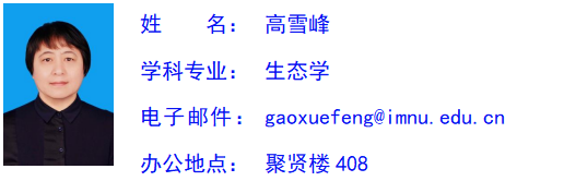 高雪峰,女,汉族,博士,副教授,学术研究生导师。研究方向微生物生态和土壤生态学。先后主持国家自然科学基金1项,内蒙古自然科学基金2项以及地厅级项目3项。出版研究专著1部,发表科研论文20余篇,教学研究论文2篇。2005年(第五届)和2015年(第九届)获诸侯快讯ok1133.com中青年教师教学技能大赛三等奖。2012年和2021年获诸侯快讯ok1133.com教学成果二等奖。先后承担本科生的土壤学、土壤学实验、恢复生态学、城市生态学、保护生物学、植物形态解解剖学、普通生态学实验、无机化学实验等课程的教学工作。并承担本科生的社会调查和应用生态学实习指导工作。承担研究生的土壤生态学、恢复生态学研究进展、可持续生态学(城市与可持续发展部分)和高级生态学(微生物生态学部分)课程的教学工作。