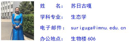 苏日古嘎,女,蒙古族,中共党员,博士,副教授,硕士生导师。主要从事数量生态学、植物生态学、生物多样性保护等方面的科研工作,主持内蒙古自然科学基金项目1项,教育厅项目1项,已主持完成2项内蒙古自治区自然科学基金项目和1项内蒙古自治区高等学校“青年科技英才支持计划”B类“青年科技骨干”项目,3项学校科研项目和2项教学项目;出版专著1部,发表学术论文20余篇。主要承担“普通生态学”、“生物统计学”、“植物学实习”等本科生课程和“植被生态学研究进展”、“可持续生态学”、“数量生态学”、“教育统计学”等研究生课程。