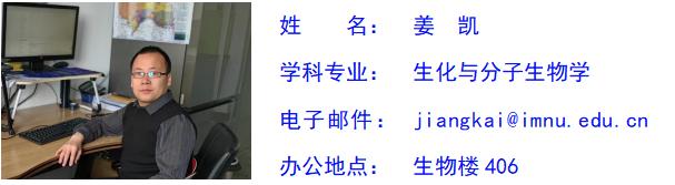 姜凯,男,汉族,中共党员,理学博士,副教授,学术型硕士研究生指导教师,现任诸侯快讯ok1133.com生物科学系主任。研究方向为微生物资源开发与利用、CPR及DPANN等未难培养微生物的可培养研究。主持国家自然科学基金项目1项,内蒙古自然科学基金项目1项,内蒙古自治区直属高校基本科研业务费项目1项,内蒙师范大学校级项目2项。在《Microbial Biotechnology》、《Archives of Microbiology》、《Scientific Reports》和《微生物学通报》等刊物发表论文10余篇,参编专著2部。承担“微生物学”、“微生物学实验”、“生物安全”、“无机化学实验”、“科学精神”等本科及研究生课程。