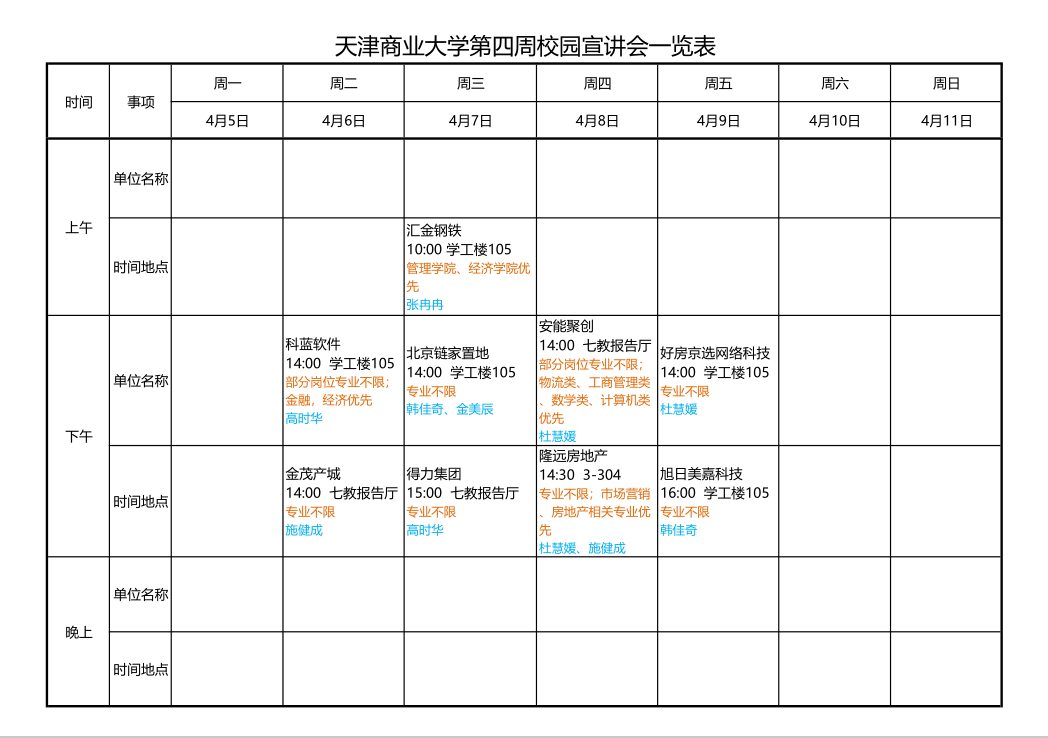 我校为向天商学子传达相关组织、团体或企业的情况、文化价值观、人力资源政策、校园招聘的程序和职位介绍等信息,接下来的第四周所举办招聘会的相关信息如下。