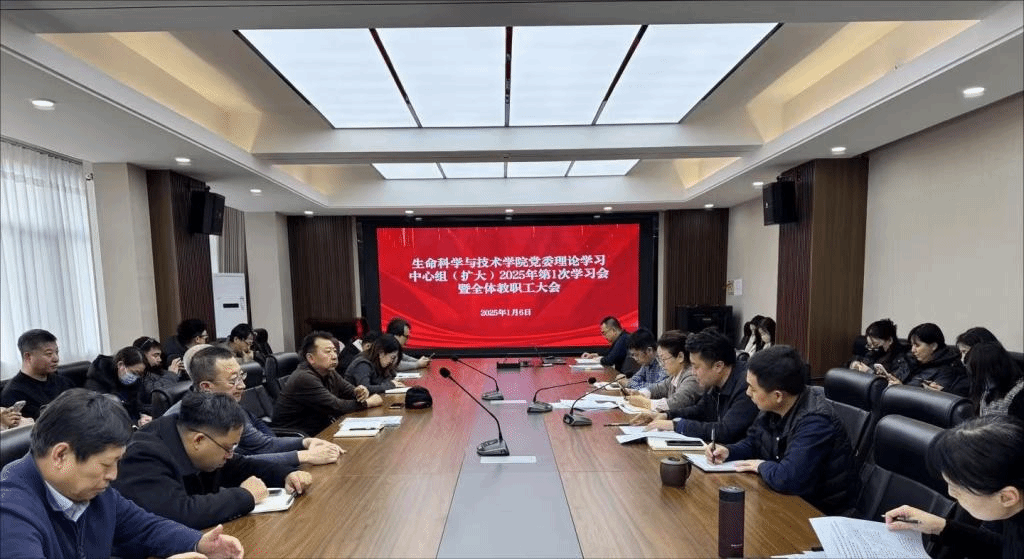 1月6日下午,学院在生物楼三楼会议室召开党委理论学习中心组(扩大)2025年第1次集体学习会暨全体教职工大会。学院领导班子、全体教职工参加会议。