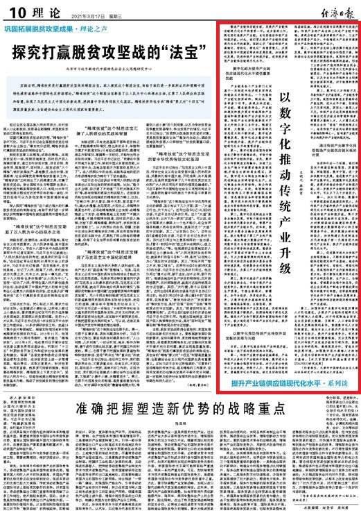 3月17日,《经济日报》(理论版)刊发吕明元教授主持的国家社科基金重点项目成果文章“以数字化推动传统产业升级”,该文章也是与天津市工信局合作建设的校级平台“数字经济与绿色发展研究中心”挂牌以来的研究成果之一。