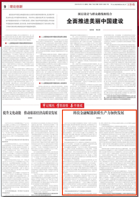 6月21日,《天津日报》(理论创新版)刊发我校beat365在线体育官网登录入口、天津市中国特色社会主义理论体系研究中心beat365在线体育官网登录入口基地研究员张彤进副教授理论文章“科技金融赋能新质生产力加快发展”。文章指出,新质生产力是创新起主导作用,由技术革命性突破、生产要素创新性配置、产业深度转型升级而催生的先进生产力质态,具有高科技、高效能、高质量特征。科技金融有助于推动科技创新、优化生产要素配置、助力产业转型升级,是赋能新质生产力发展的重要力量。文章从完善科技金融政策体系,加强财政金融协同联动;创新科技金融产品和服务,解决科创企业融资难题;构建科技金融良好生态,提升综合金融服务能力三个层面对科技金融推动新质生产力发展的实践路径进行了具体阐释。